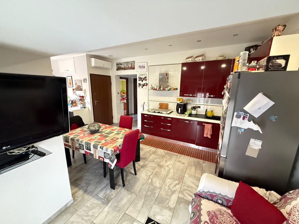 Luminoso soggiorno con cucina a vista e accesso al balcone